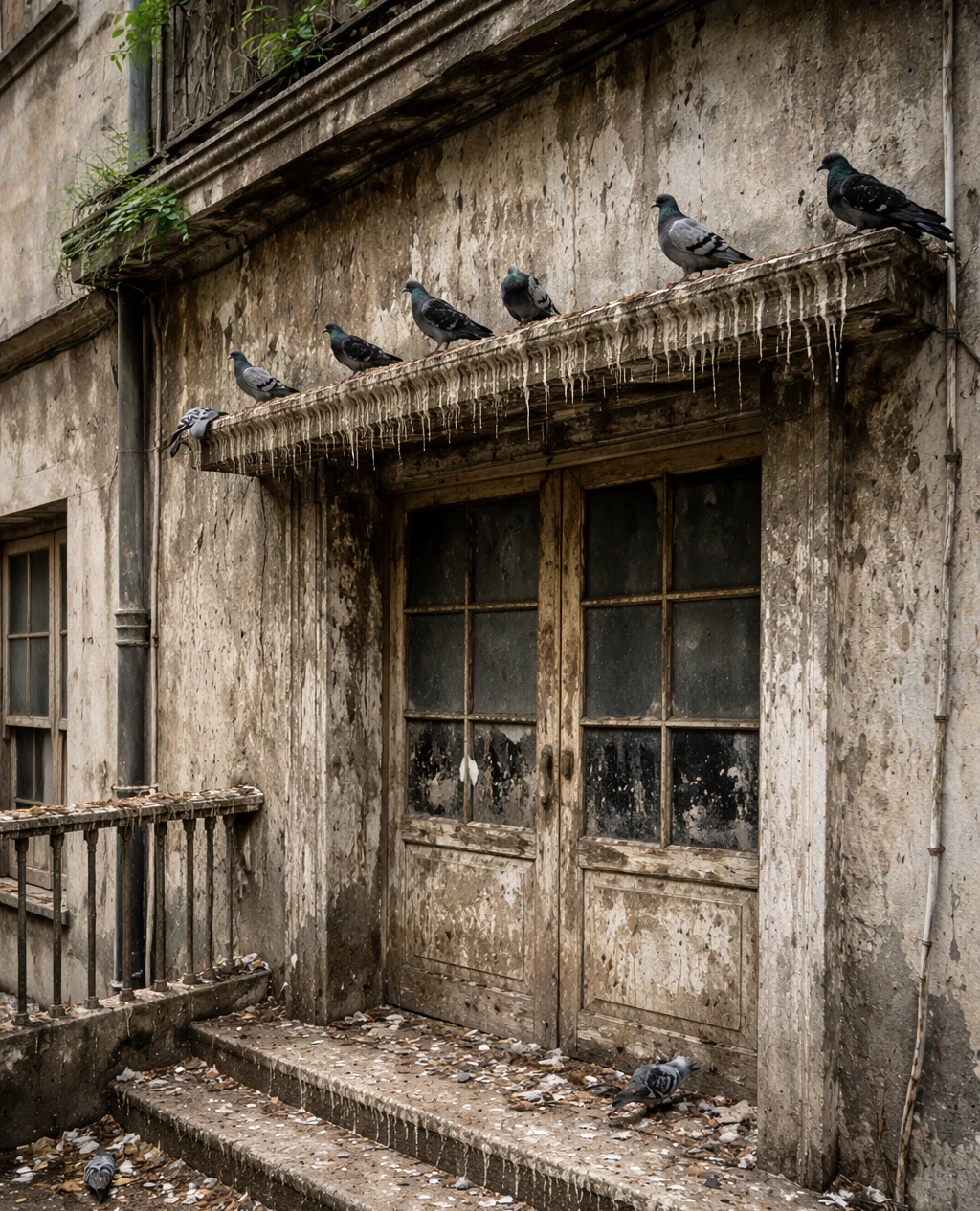 Il disordine che un uccello lascia dietro può danneggiare la struttura in diversi modi. Nidi e materiali di nidificazione possono ostruire i tubi o addirittura presentare rischi di incendio vicino ai cavi elettrici. Gli escrementi hanno proprietà acide che possono togliere la vernice, che si tratti di auto o rivestimenti. Le deiezioni deposte su monumenti ed edifici, oltre a costituire potenziale veicolo di trasmissione di parassiti e di agenti di infezione, sciogliendosi con le piogge, rilasciano sostanze acide che intaccano il carbonato di calcio della pietra e del marmo in particolare che può macchiarsi e sgretolarsi.